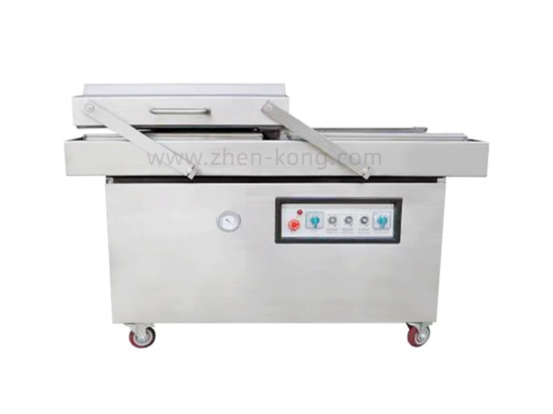 双室真空包装机工作效率高。机器采用一机两室,一侧真空室工作时,另一侧可以放置包装物料,机器连续工作省时省力。一个真空室可以放入多包真空袋,从而提高工作效率。工作过程均为全自动控制,操作简单,方便快捷。真空包装后物料防潮,防氧化,易于存储和运输。